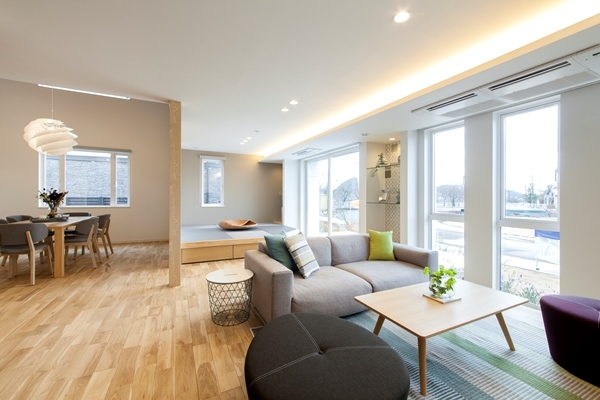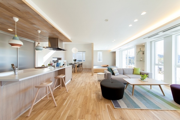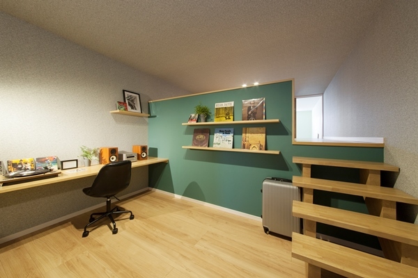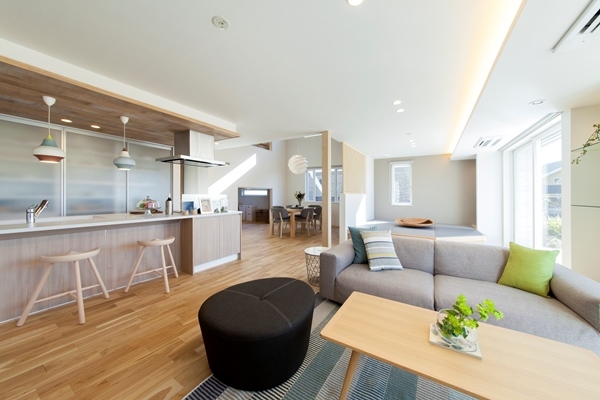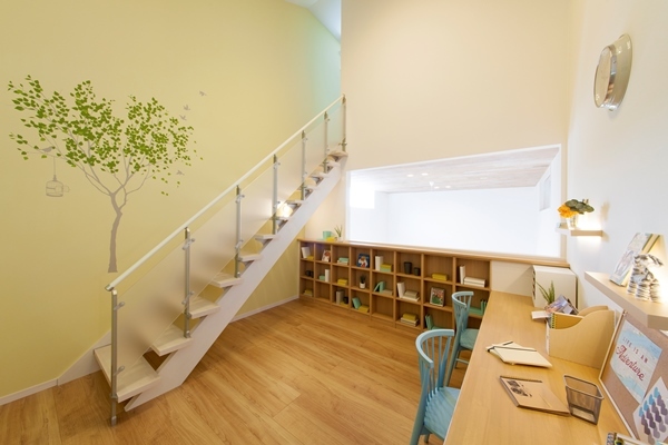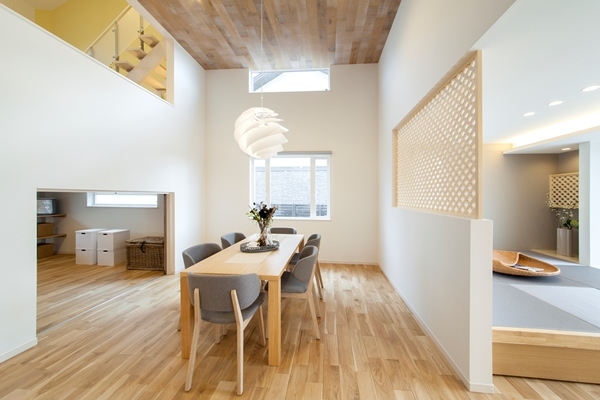 高さ1.4mのハーフ収納や、ハーフ吹抜を盛り込んだ2階建て6層構造。時を経ても美しい天然木の優しい色彩を活用し、「訪れた人が癒され、日々の楽しい暮らしをイメージ」できる住まいです。